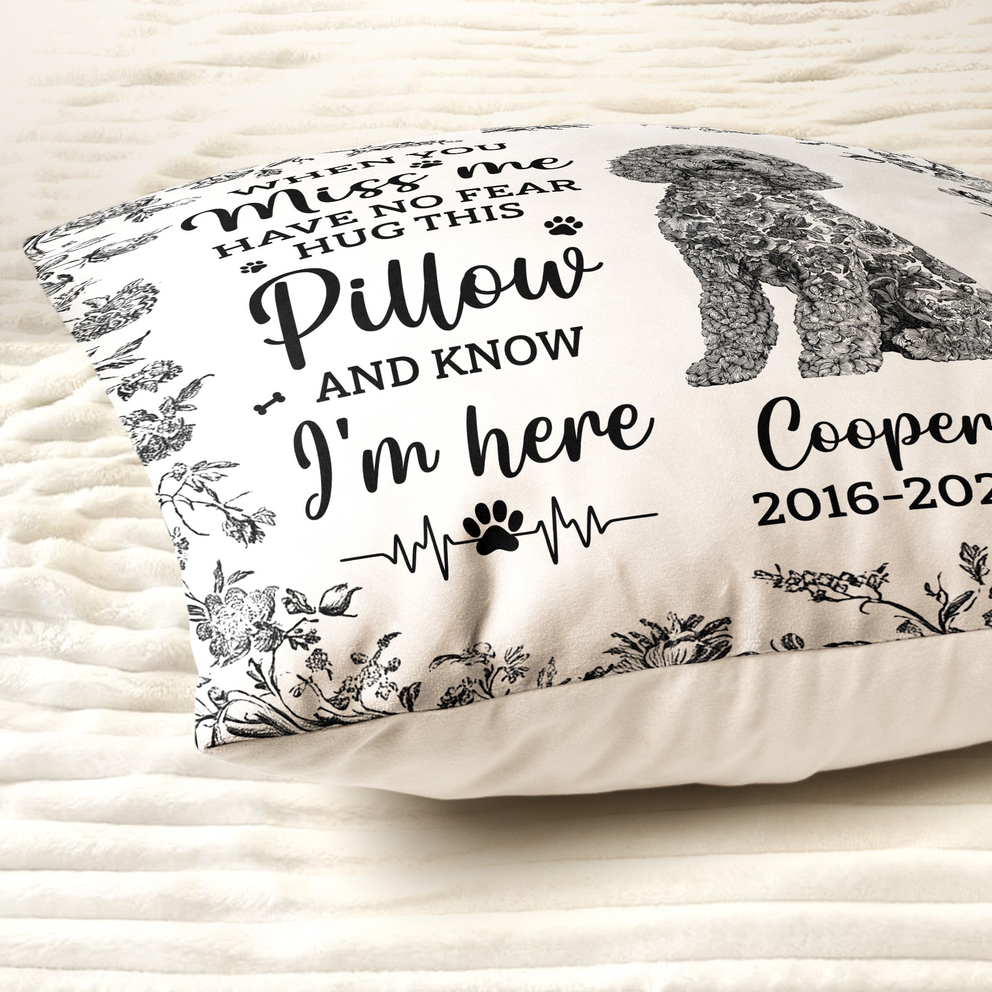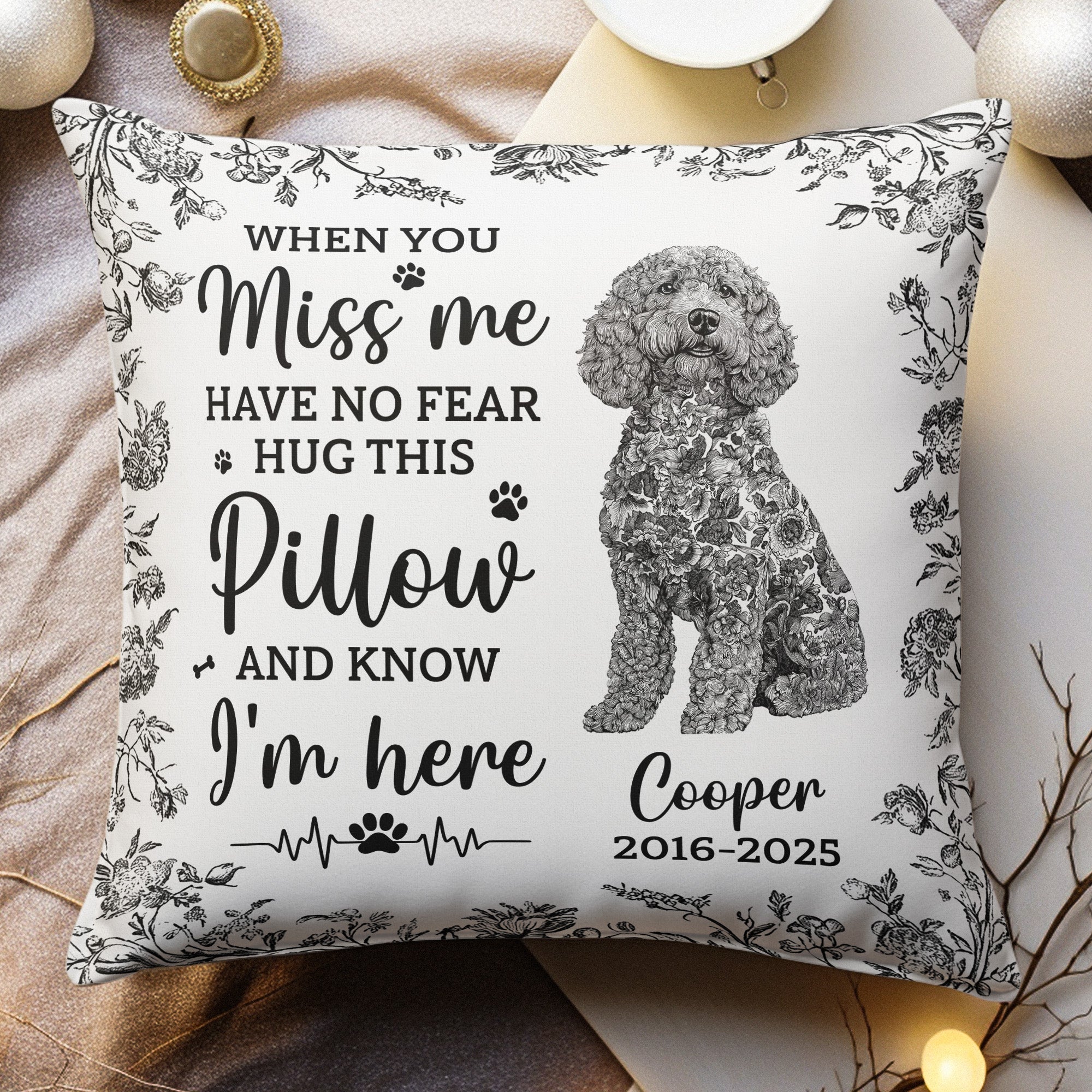 Perfect for dog lovers and pet enthusiasts, the Dog Memorial Toile De Jouy Sympathy Gift is more than just a pillow. Incorporated within its design is a heartwarming message to comfort anyone missing their furry friend. Its gentle reminder that their pet is always with them, offers solace during difficult times. The personalized touch makes it an ideal and meaningful keepsake to hug tightly during moments of sorrow.